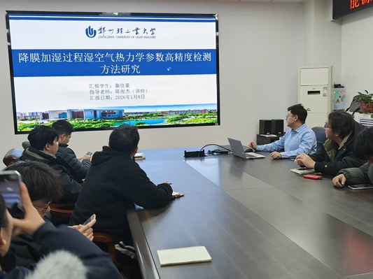 在研究生学术汇报环节,同学们围绕能源、储能、节能技术等多个前沿方向展开分享杨林以“壁面及多孔内溶液蒸发动力学特性研究”为题,揭示了多孔结构微纳尺度下溶液蒸发传质机理及其对强化相变换热的重要作用;陈一平通过“含高岭石孔隙中地层液体对氢气赋存及扩散损失的分子动力学研究”,结合分子动力学模拟,阐明了地层水在多孔介质中与氢气的竞争吸附机制及其对氢气长期封存安全性的影响;秦佳豪以“氢降膜加湿过程湿空气热力学参数高精度检测方法研究”为题,基于实验数据提出了一种适用于降膜加湿过程的湿空气热力学参数高精度实时检测方法;杨乐滨围绕“基于数字孪生的HVAC系统建模及多变量协同优化研究”,实现了系统负荷与能耗的高精度预测及跨工况泛化;盛宇健以“高功率芯片的歧管微射流与微通道复合冷板的流动与传热特性研究”为题,探讨了喷嘴与销翅密度分布等结构参数及微通道对系统压降与散热性能的影响;王铭超以“低温等离子体预处理对青柠干燥特性及品质影响研究”为题,揭示了低温等离子体预处理对青柠干燥过程及产品品质的作用规律与机理。